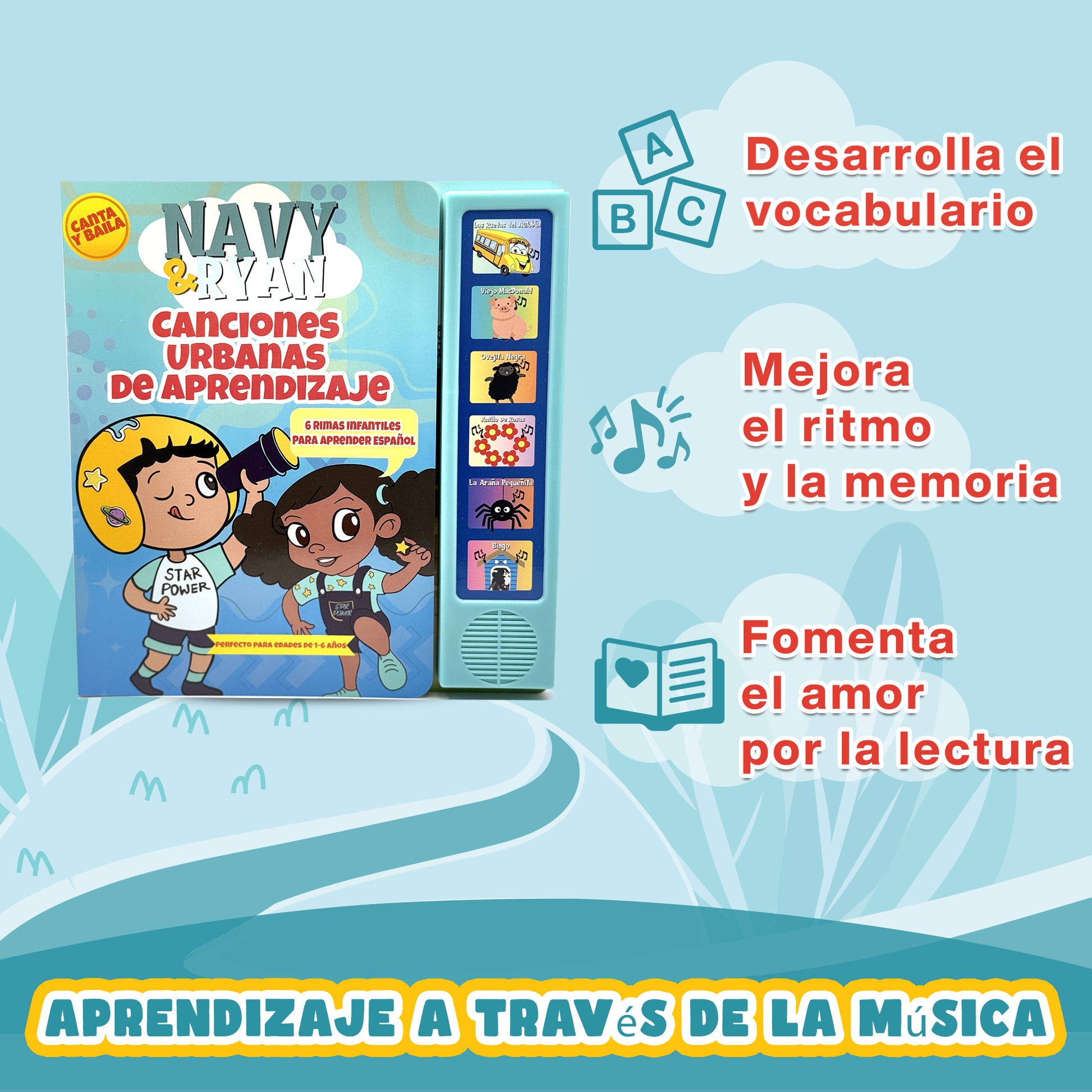 ¡Presentamos el primer libro de sonidos de rimas infantiles en el estilo urbano! Este libro musical interactivo para aprender español toma las canciones infantiles clásicas y les da un remix urbano que a tu peque le encantará. Perfecto para edades de 1 a 6 años, fomenta el aprendizaje sin pantallas a través de la música y la repetición. Presiona los botones de sonido para acceder ritmos y letras que aumentan el vocabulario y la memoria.